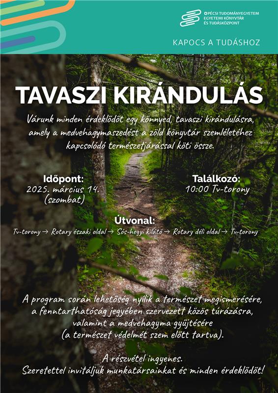 Csatlakozz a PTE Egyetemi Könyvtár és Tudásközpont által szervezett ingyenes tavaszi kiránduláshoz, amelyre minden érdeklődőt szeretettel várunk!